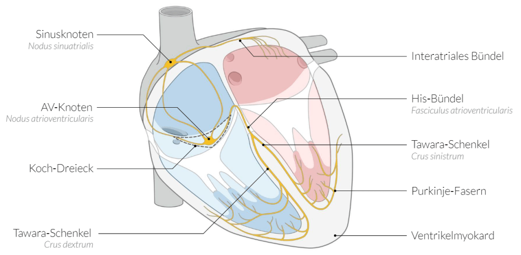 Das Erregungsleitungssystem besteht aus speziellen Herzmuskelzellen welche die Eigenschaft haben Aktionspotentiale, ähnlich wie Nervenzellen, weiterzuleiten. Strukturiert wird es über seriell geschaltete Erregungsbildungszentren an denen jeweils Schrittmacher-Potentiale mit unterschiedlicher Frequenz gebildet werden. Der physiologische Schrittmacherknoten ist der Sinusknoten, mit einer Eigenfrequenz in Ruhe um die 60-80/min. Diese Aktionspotentialfrequenz ist höher als die des nächst untergeordneten Schrittmachers (AV-Knoten, ca. 40-50/min) usw. Die vom Sinusknoten ausgehenden Potentiale erregen somit den AV-Knoten bevor er selbst ein Aktionspotential generieren kann. Somit übernimmt immer das schnellste Erregungszentrum den Takt. Fällt eines der Schrittmacherzentren aus, kann das nächst untergeordnete Zentrum mit der jeweiligen Eigenfrequenz übernehmen.