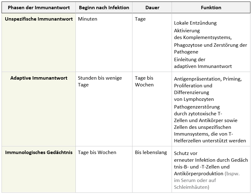 Dringt nun ein Pathogen trotz erster Schutzmaßnahme in unseren Körper ein, gibt es nun ein komplexes System aus löslichen Faktoren und Zellen, die uns weiter vor einem Krankheitsausbruch schützen – das Immunsystem. Es kann grundsätzlich in zwei Systeme unterteilt werden. Das schnell reagierende, jedoch unspezifische angeborene Immunsystem, und das langsamer arbeitende, jedoch hoch spezifische, erworbene Immunsystem. Beide Systeme sind miteinander Verbunden und arbeiten zusammen an der Abwehr von Krankheitserregern. Zusätzlich ist das spezifische Immunsystem in der Lage, ein immunologisches Gedächtnis auszubilden.