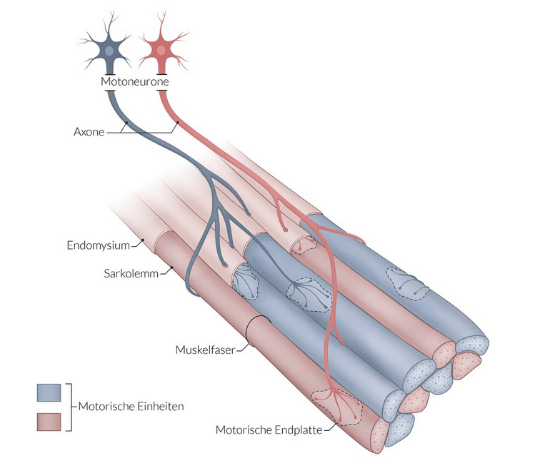 Unsere Skelettmuskeln werden durch motorische Nervenfasern aus dem Rückenmark oder von den Hirnnerven angesteuert. Ein über die Nervenbahnen weitergeleitete Aktionspotential wird an der sogenannten motorischen Endplatte – einer chemischen Synapse – auf den Muskel übertragen (siehe Kapitel Nervensystem). Die anschließende Übertragung dieses elektrischen Signals in eine mechanische Kontraktion wird als „elektromechanische Kopplung“ bezeichnet.